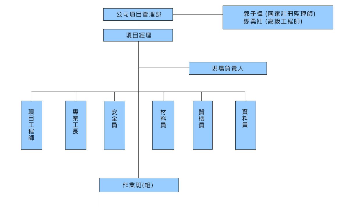 3. 質量保證體系組織機構: 為確保工程質量目標的實現,必須建立、健全、完善質量保證體系組織機構。在貫徹執行ISO9001標準的同時,按程序文件要求推動質量保證體係正常有效地運行。